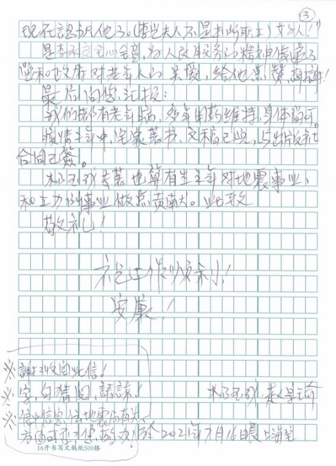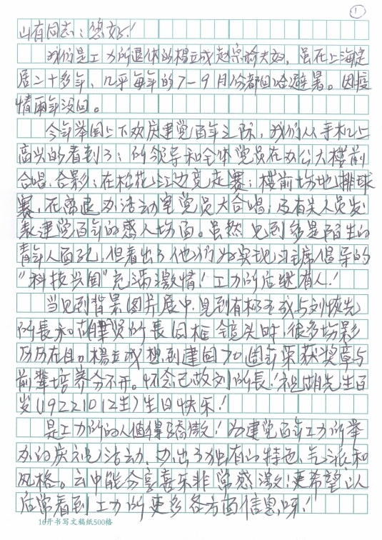 發布時間: 2021-08-20 點擊數量:2792“以人性化服務和溫情服務為宗旨,努力做到讓老同志方便、放心、滿意,感受到家人般的溫暖”,這是離退休辦公室的服務宗旨。近日,一封感謝信從遠在上海定居的老同志寄來,信里表達了對工力所在建黨百年之際取得的成績感到驕傲和自豪,重點感謝了離退辦同志對異地居住和就醫的老同志給予生活上和就醫方面的關心和幫助。他飽含感激之情地講述了幾件事,他說“我們講述幾件個人小事,但能說明工力所不單培養科技人才,為民辦事一般工作人員也是稱職的。”“全心全意為人民服務的精神傳遞了黨和政府對老年人的關愛”……老同志口中的小事都是我們為群眾服務的大事,我們要為群眾辦真事、真辦事。