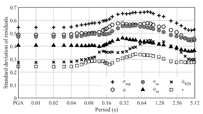 (2)單臺標準差的計算結果表明(見圖2),本研究區域的部分非遍歷假設較遍歷性假設的標準差減少了10% - 20%。事件修正后的單臺標準差φss值范圍在0.36-0.47,整體低于大部分陸地地區研究結果(0.4-0.5),表明海域地區的傳播介質引起的地震動不確定性相比于陸地區域更小,海域區域性差異沒有陸地顯著。